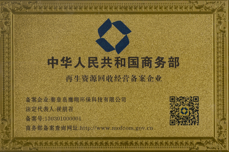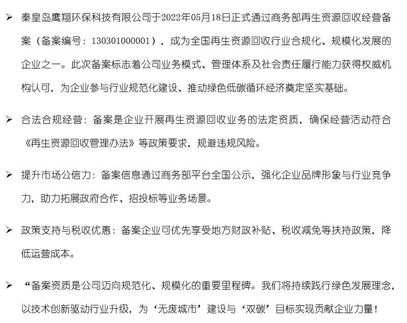 热烈祝贺[秦皇岛鹰翔环保科技有限公司]成为商务部再生资源回收经营备案企业!
